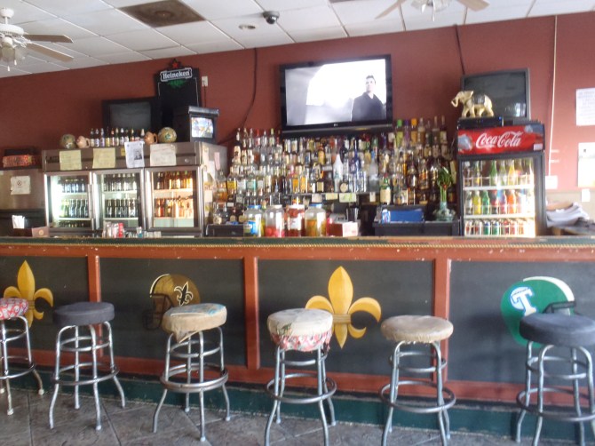 I arrived about an hour earlier than we had scheduled to meet and talk. This time I went to the bar. It’s interesting how much different the bar experience is from the dining one. On the bar, I saw painted LSU, Tulane, fleur-de-lis(es?), and Saints helmets. There were two TVs: one at the bar and one close to the windows overlooking N. Carrollton. One was giving highlights of the soccer world while the over was playing music videos of Mexican pop stars. The clientele was a mix of both working-class Latinos and Americans.