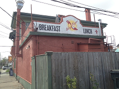 The setting: The neighborhood has a colorful mixture of buildings and architecture as well as things which have come to be known as typical New Orleans. Conveniently, Monica’s hotel, The Canal St Inn, is located a block away, making it the perfect distance for a leisurely stroll  to the restaurant for any meal of the day.  The streets are lined with palm trees and oak trees. The funeral home next door, something that would normally be considered unappetizing, is bright orange and so lovely that it becomes a landmark for people unfamiliar to the neighborhood as well as  neutralizes  death among life and food as part of our everyday lives.