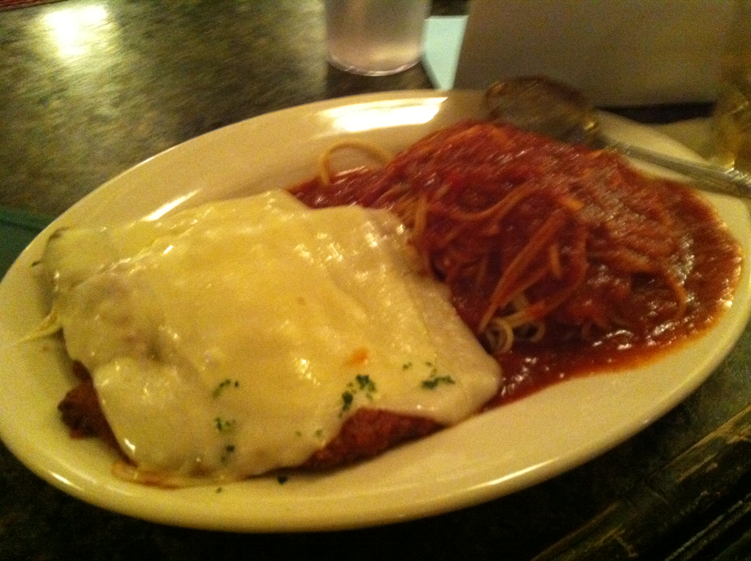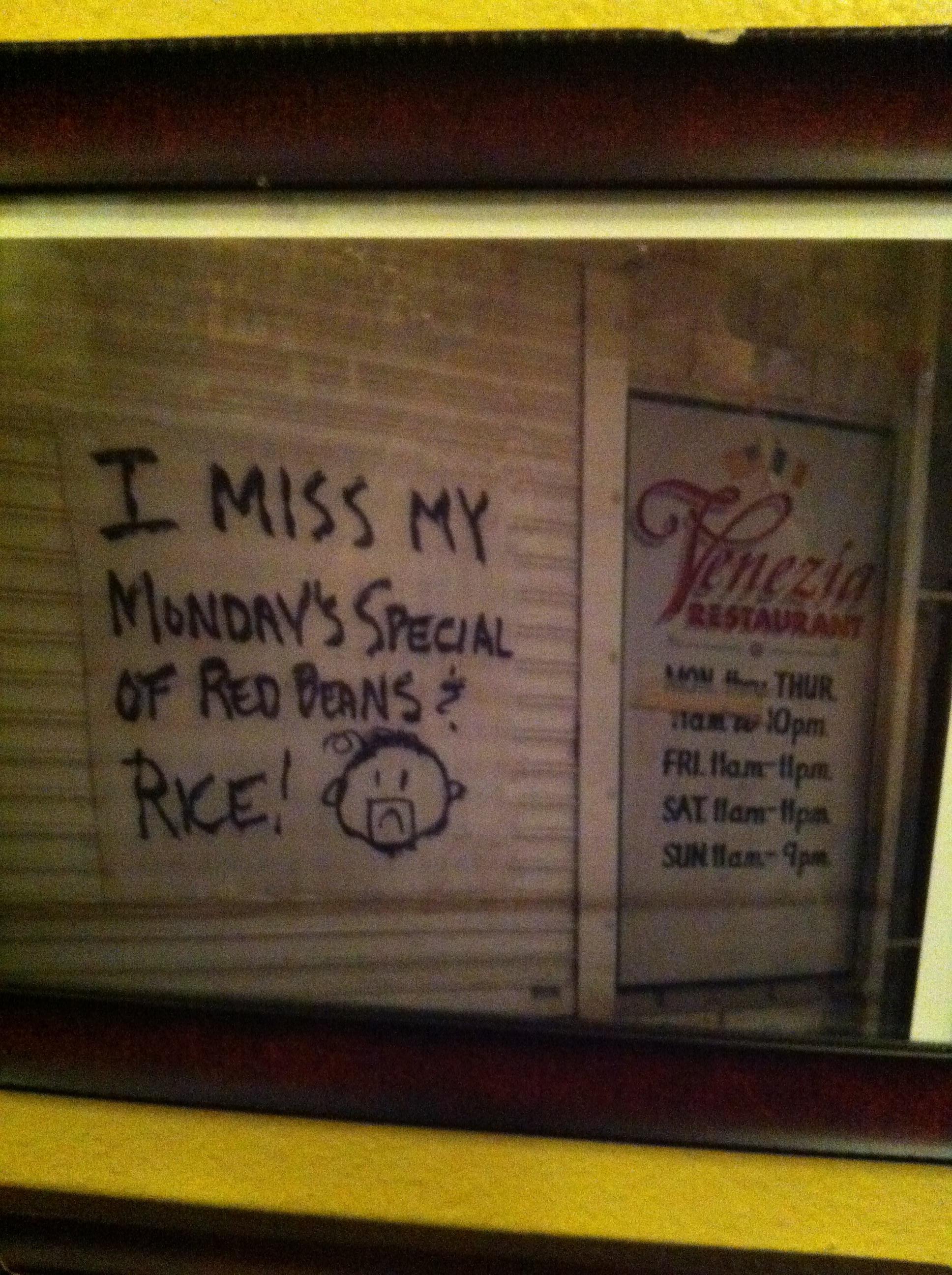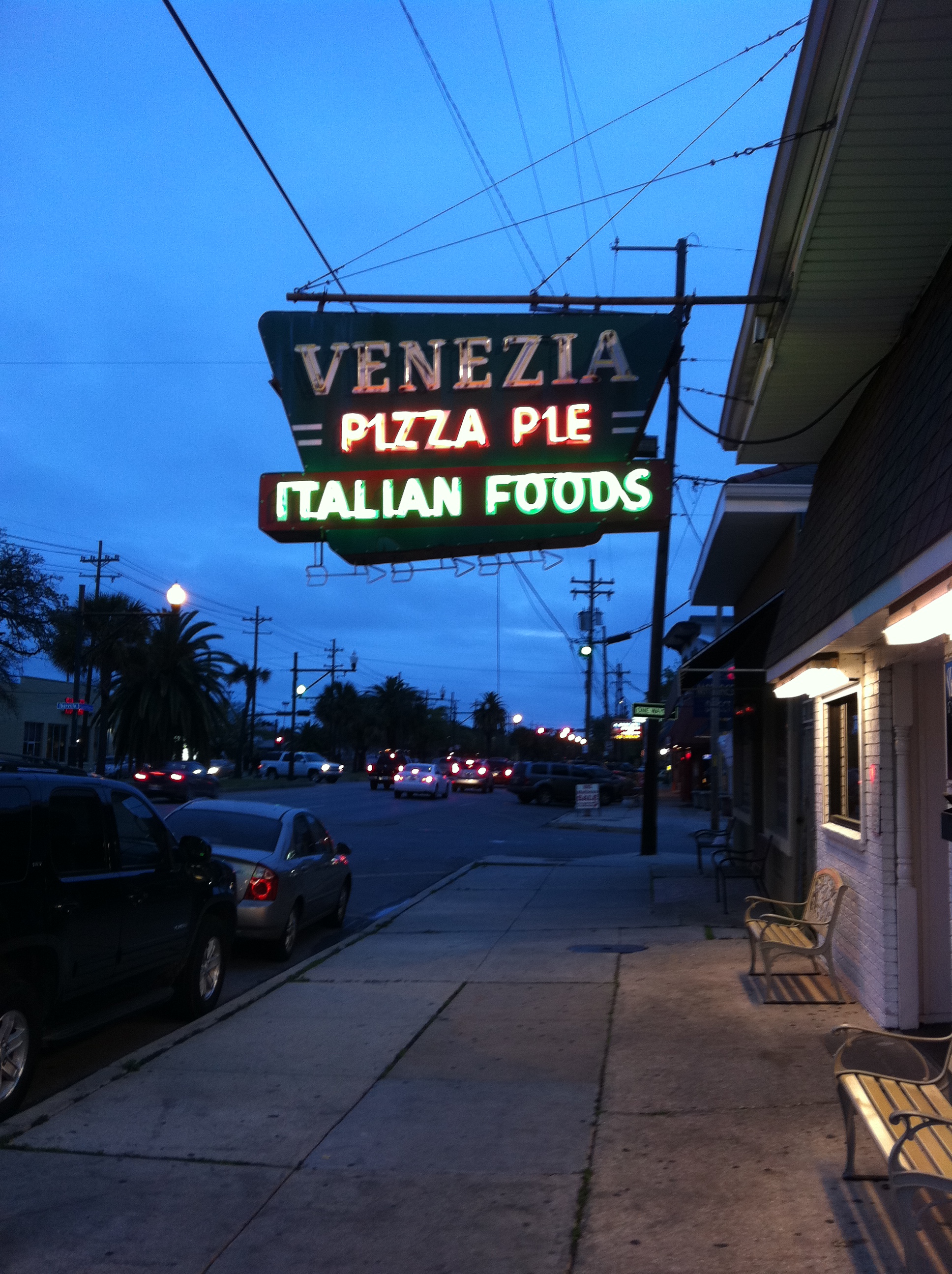 It’s been about a month since my first blog entry. Jenny and I are still working on Lemonade Parade and Venezia’s. We’ve since achieved an interview with the owner of Venezia’s, Mr. Anthony ‘Tony’ Bologna. Mr. Bologna described Venezia’s as a family-owned-and-operated establishment. He was full of pride while explaining that his son and daughter helped re-decorate the restaurant after Katrina destroyed the Canal/Carrollton area. The restaurant has white linen and pictures of Venice on the walls but doesn’t forget its loyalty to New Orleans. Pictures of Saints, LSU, and Katrina memorabilia make the dining and bar area seem like you’re eating at a friend’s parent’s house. The restaurant is busy and the close seating helps spark up conversations between patrons. Jenny and I remarked on our fellow diner’s caper pizza but weren’t disappointed when our veal entrees came out. The food is way more than you can finish and during the interview, Mr. Bologna explained that he kept his prices down for the people and its working because the people definitely come. We watched as the early birds enjoyed their dinner and then were amazed with the swarm of people who came around 7pm for dinner. The building filled with laughter and clinking plates. Mr. Bologna explained that they were originally among the few pizza places in the area, but he didn’t see Dominos or the pending MidCity Market as a threat because it wasn’t the same type of food nor was it the same type of atmosphere or service. He explained that all the restaurants in the area actually helped each other. “The more people the better” he said and continued that even if someone ate next door, they’d say “we have to try that Italian place next time, so they still come.” Jenny and I sat at the bar and enjoyed drinks, more food than we could eat, and then coffee so we didn’t slip into an Italian food coma on the way home. Our bartender/waiter, Chris, was more than accommodating. He’s worked at Venezia’s going on five years and also attends UNO. This showed aspects of the UNO and Canal/Carrollton community merging. Metairie is also a factor in Venezia’s, where their other location is found. Mr. Bologna explained that the street cars increased business because tourists were able to venture to different parts of the city, including MidCity, and he appreciated this. But, he still made sure to treat his loyal local customers with reverence. After Katrina, this reverence became even stronger. He explained that he was touched to find out that people who were displaced, temporarily and, or permanently, still kept Venezia’s on their list of New Orleans must haves upon returning or visiting home. Mr. Bologna explained that his contribution to Venezia’s was built on the idea of family and that his mission was to perpetuate that feeling through his service and food. Compared to the bustling inside of Venezia’s the outside is relatively unassuming. The sign is neon lighting—part of its method of marketing may be, as an authentic Italian restaurant located in New Orleans, the very lack of seemingly deliberate marketing. It’s plain, rustic, white-walled exterior lets the food speak for itself.