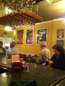 I arrived about an hour earlier than we had scheduled to meet and talk. This time I went to the bar. It’s interesting how much different the bar experience is from the dining one. On the bar, I saw painted LSU, Tulane, fleur-de-lis(es?), and Saints helmets. There were two TVs: one at the bar and one close to the windows overlooking N. Carrollton. One was giving highlights of the soccer world while the over was playing music videos of Mexican pop stars. The clientele was a mix of both working-class Latinos and Americans.